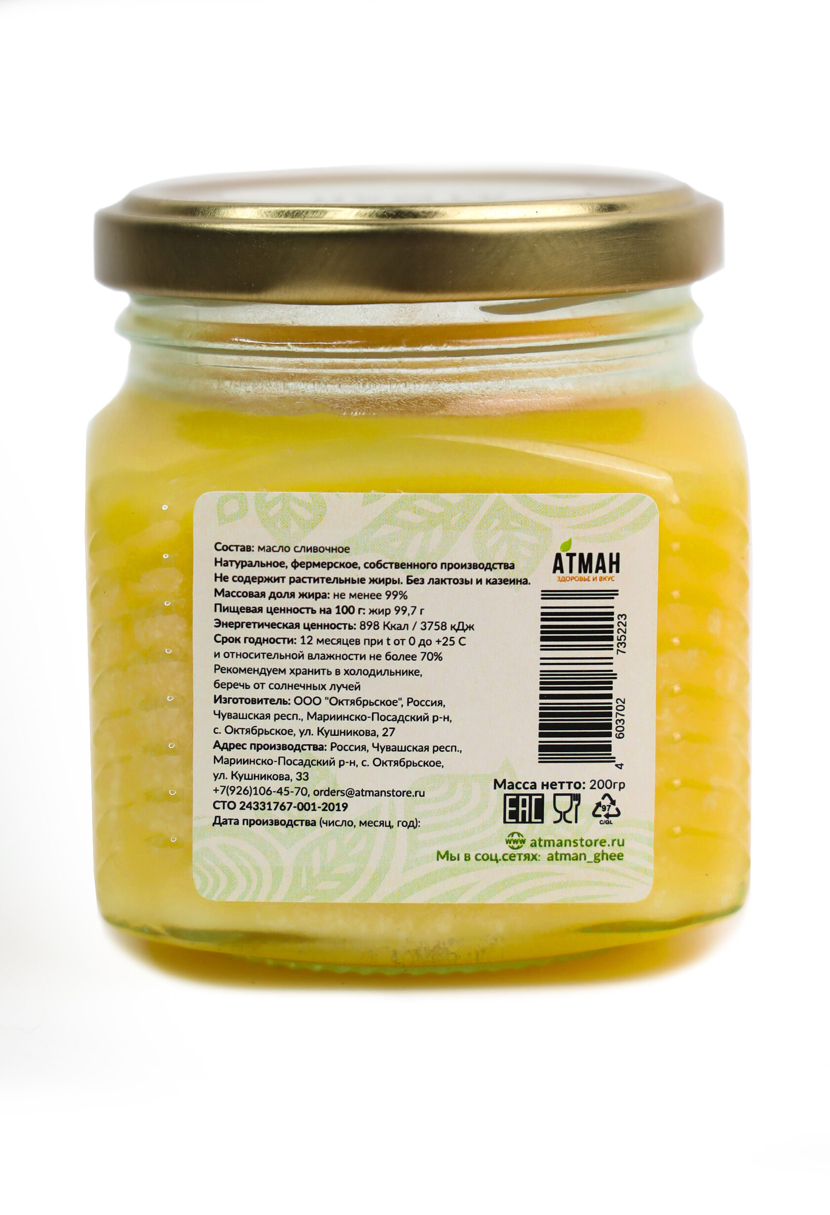 Масло ГХИ — особый вид топленого масла, которое мы бережно протапливаем около 6 часов из своего фермерского сливочного масла с соблюдением традиций аюрведы, после чего вручную очищается, процеживается и медленно, естественным образом охлаждается.