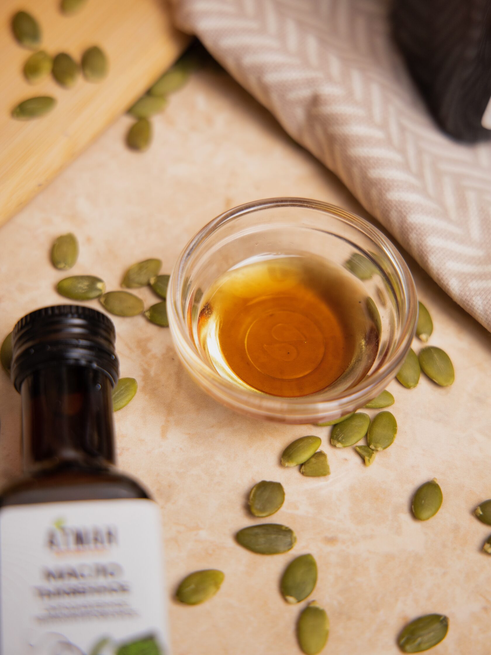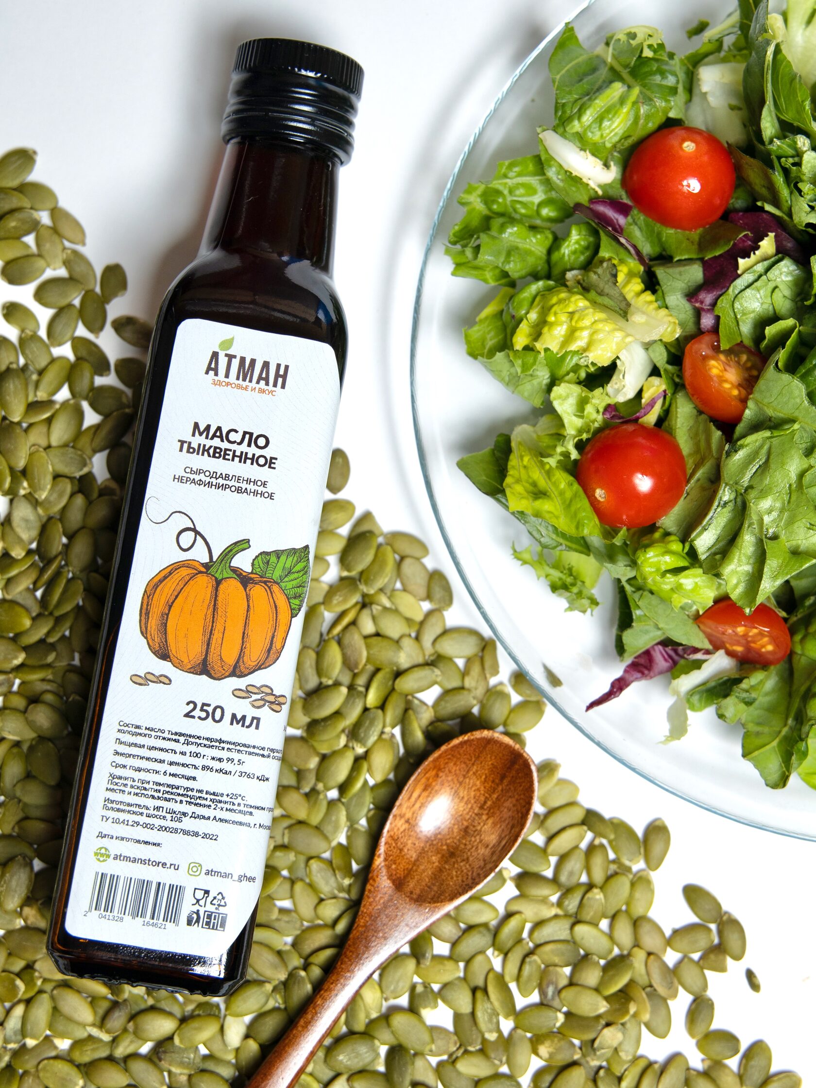 100% масло семян тыквы, полученное в результате бережного холодного отжима – семена в льняном мешочке отжимаются под дубовым прессом